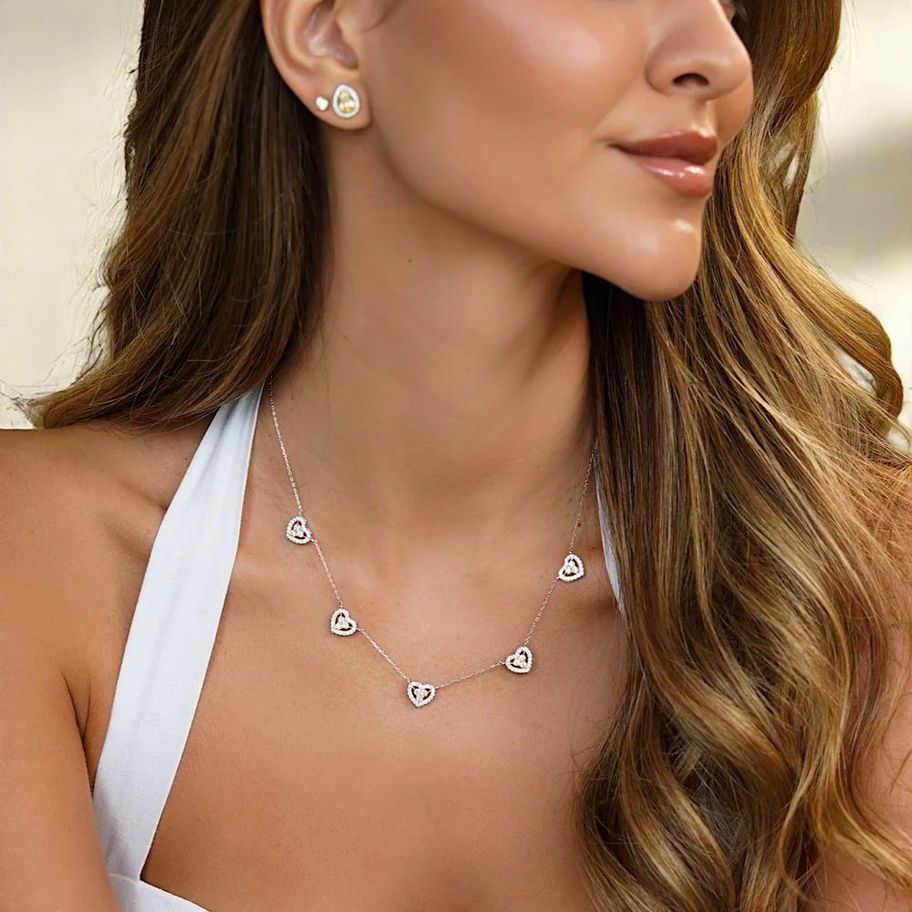 Gargantilha com pingentes de coração, cravejados em micro zircônias.